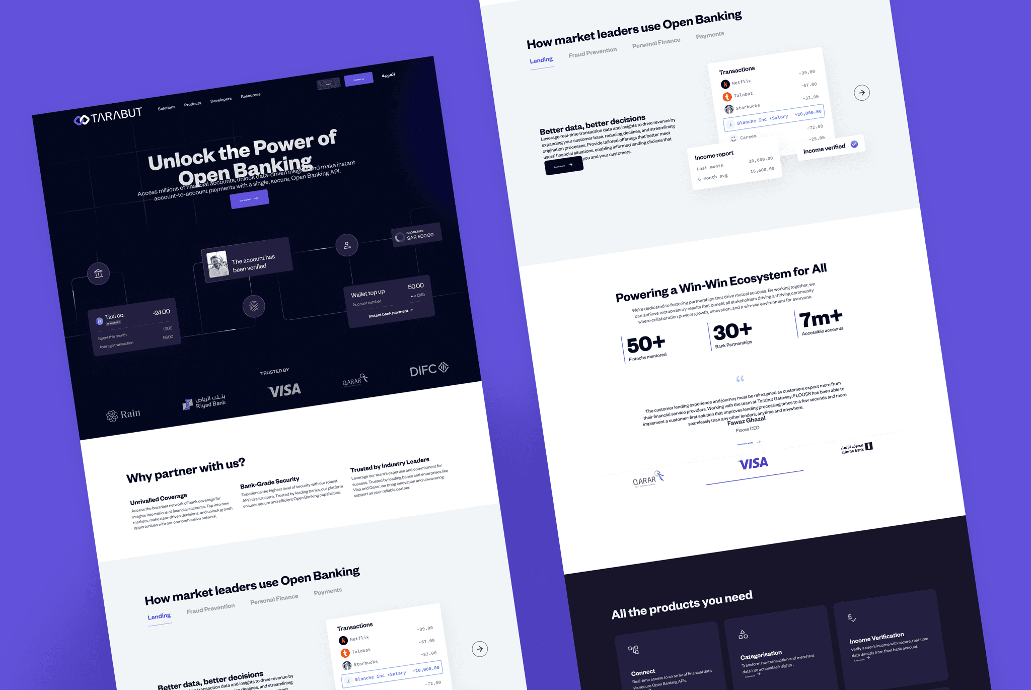 Tarabut is paving the way for an accessible, personalised and connected financial ecosystem. With the broadest connectivity, we empower banks, lenders, fintechs, and startups to unlock their full potential by driving innovation in financial services across the region.